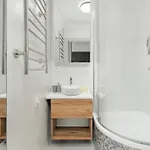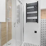 Stylish Grey Apartments With A City View In Poznan By Renters z miejscem do siedzenia jest wyposażony w sofę oraz nowoczesne udogodnienia, takie jak TV i telewizja satelitarna. Obiekt noclegowy zapewnia parkiet na podłodze. W łazience znajdują się oddzielna toaleta i prysznic, jak również suszarka do włosów i ręczniki kąpielowe.